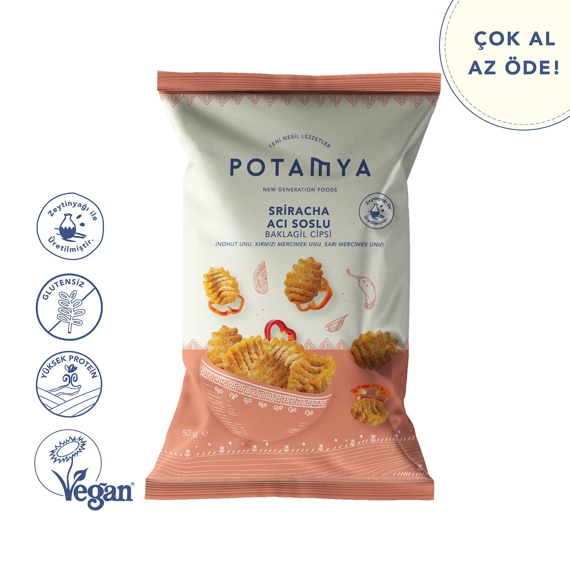 Inhalt: Hülsenfruchtmehl 70 % (Kichererbsen 56 %, rote Linsen 7 %, grüne Linsen 7 %), braunes Reismehl, Olivenöl, scharfe trockene Gewürzmischung 10 % (scharfes rotes Paprikapulver, süßes rotes Paprikapulver, Zwiebelpulver, Knoblauchpulver, Kreuzkümmelpulver, Pimentpulver, Reisstärke, weißes Pfefferpulver, Hefeextrakt, Zitronenpulver, Meersalz).