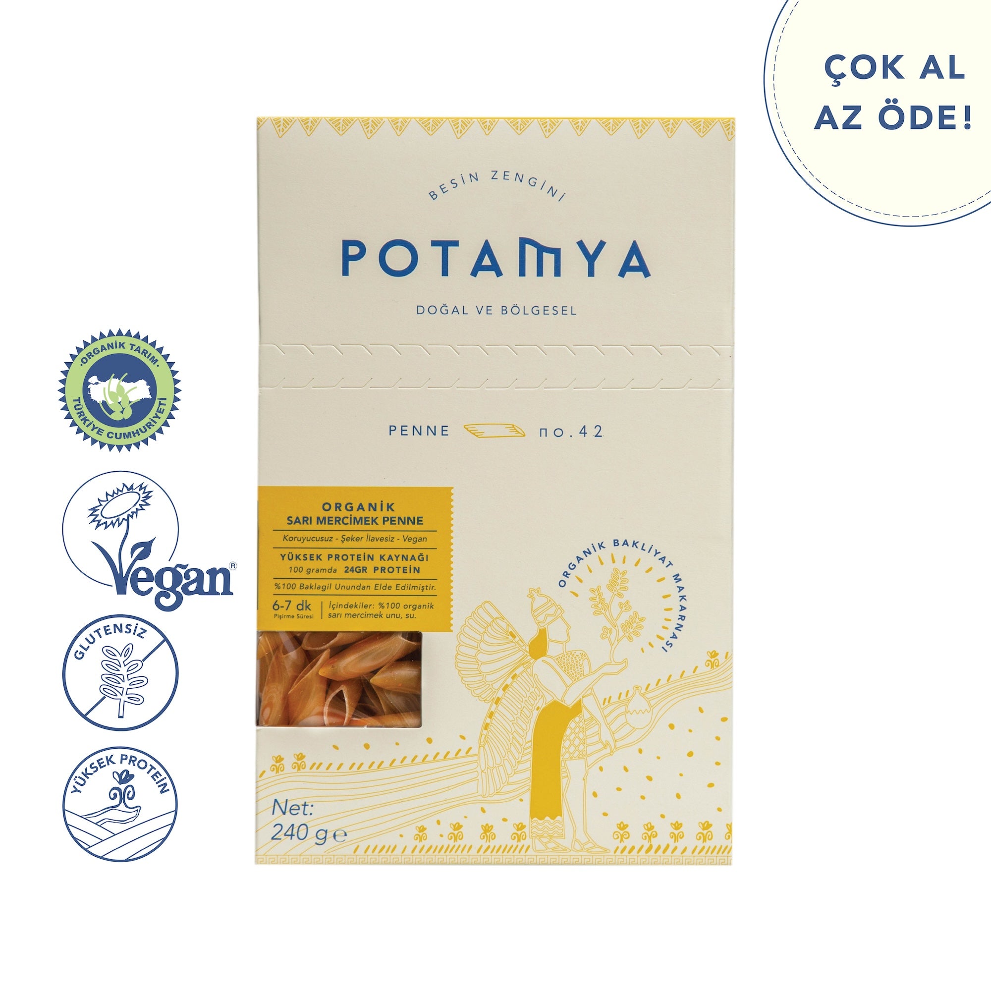 Penne, sorgfältig zubereitet aus 100 % Bio-Gelblinsenmehl.